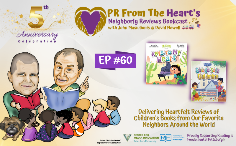 We cordially invite you and your little ones to join our John Masiulionis and David Newell (who played the beloved Mr. McFeely on Mister Rogers’ Neighborhood) for Episode #60 of PR From The Heart’s Neighborly Reviews Bookcast, as they spotlight Shireen Eddleblute’s award-winning Fintale$ series—Keys to My Heart and Garage Sale Goldmine (published by Sprouting Sparks, Bear with Us Productions, and Miriam Laundry). ![]()
